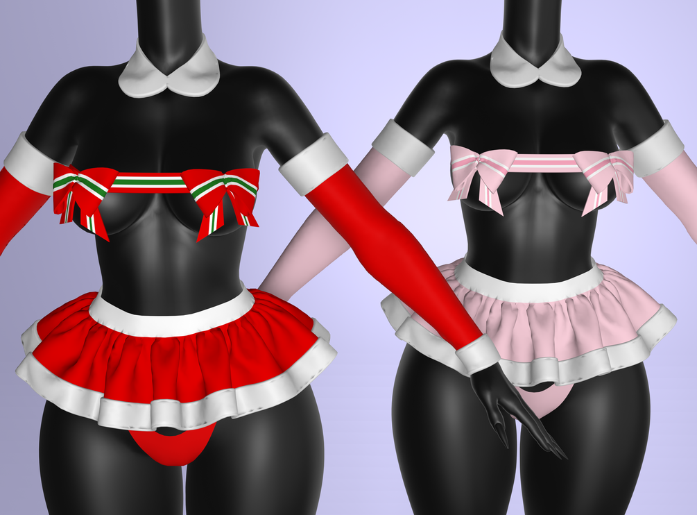 Includes ribbon top, fur trim panties, fur trim skirt, fur trim arm warmers, fur collar.